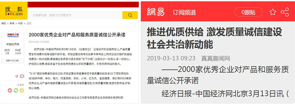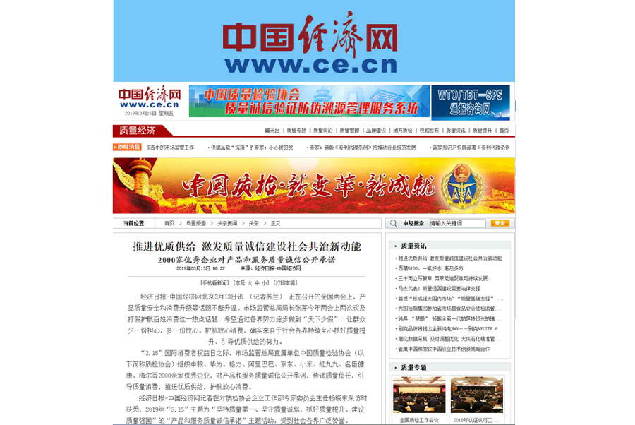 •中國經(jīng)濟網(wǎng)《推進優(yōu)質(zhì)供給 激發(fā)質(zhì)量誠信建設社會共治新動能 2000家優(yōu)秀企業(yè)對產(chǎn)品和服務質(zhì)量誠信公開承諾》