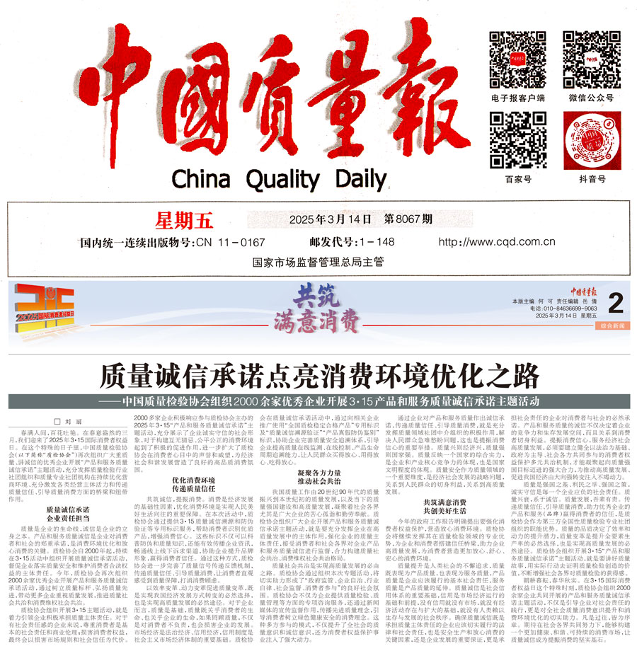 《中國(guó)質(zhì)量報(bào)》(2025年3月14日刊)發(fā)布:質(zhì)量誠(chéng)信承諾點(diǎn)亮消費(fèi)環(huán)境優(yōu)化之路——中國(guó)質(zhì)量檢驗(yàn)協(xié)會(huì)組織2000余家優(yōu)秀企業(yè)開(kāi)展3·15產(chǎn)品和服務(wù)質(zhì)量誠(chéng)信承諾主題活動(dòng)