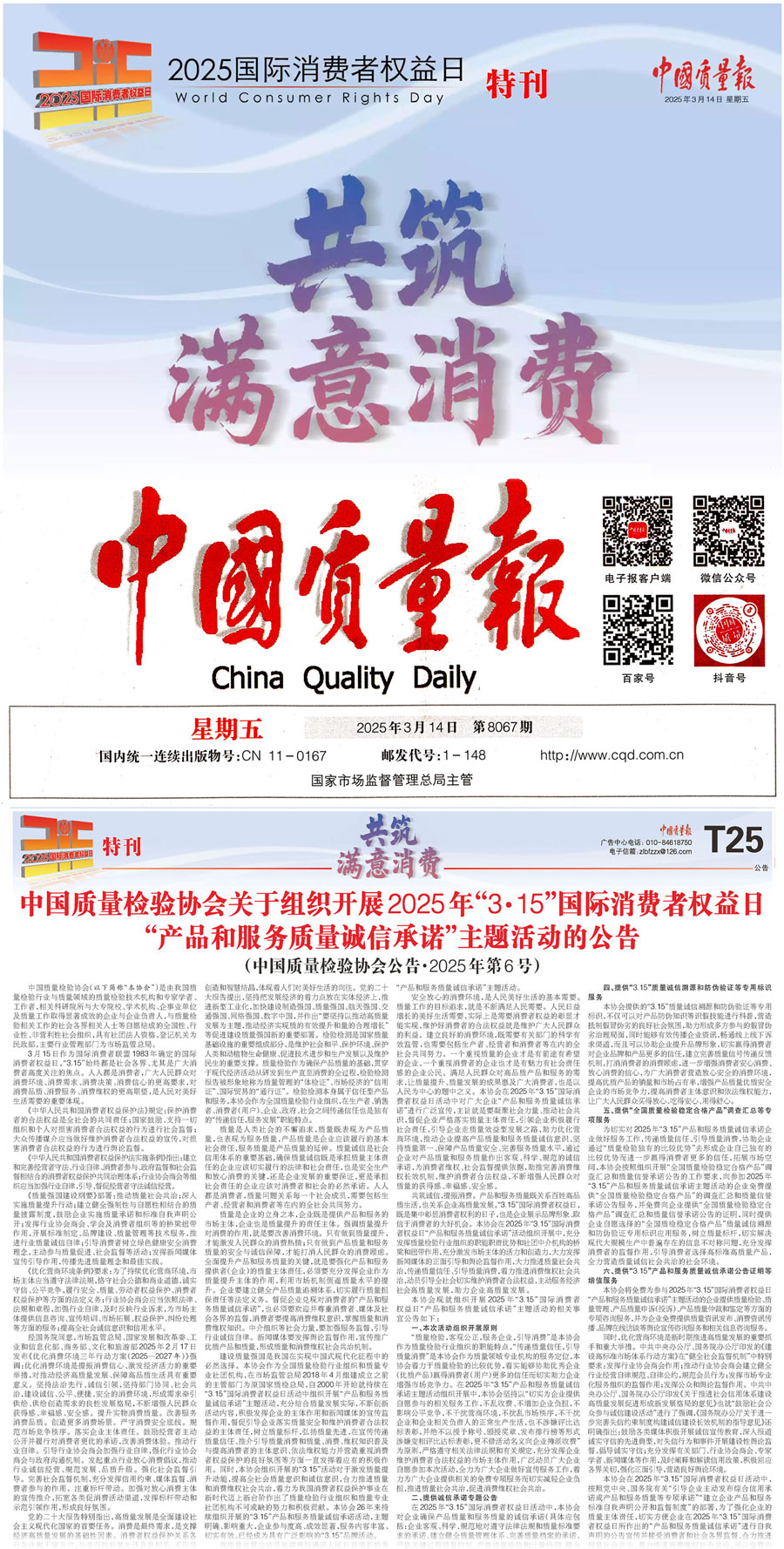 《中國(guó)消費(fèi)者報(bào)》(2025年3月15日刊)發(fā)布:中國(guó)質(zhì)量檢驗(yàn)協(xié)會(huì)關(guān)于組織開(kāi)展2025年“3·15”國(guó)際消費(fèi)者權(quán)益日“產(chǎn)品和服務(wù)質(zhì)量誠(chéng)信承諾”主題活動(dòng)的公告(2025年第6號(hào))