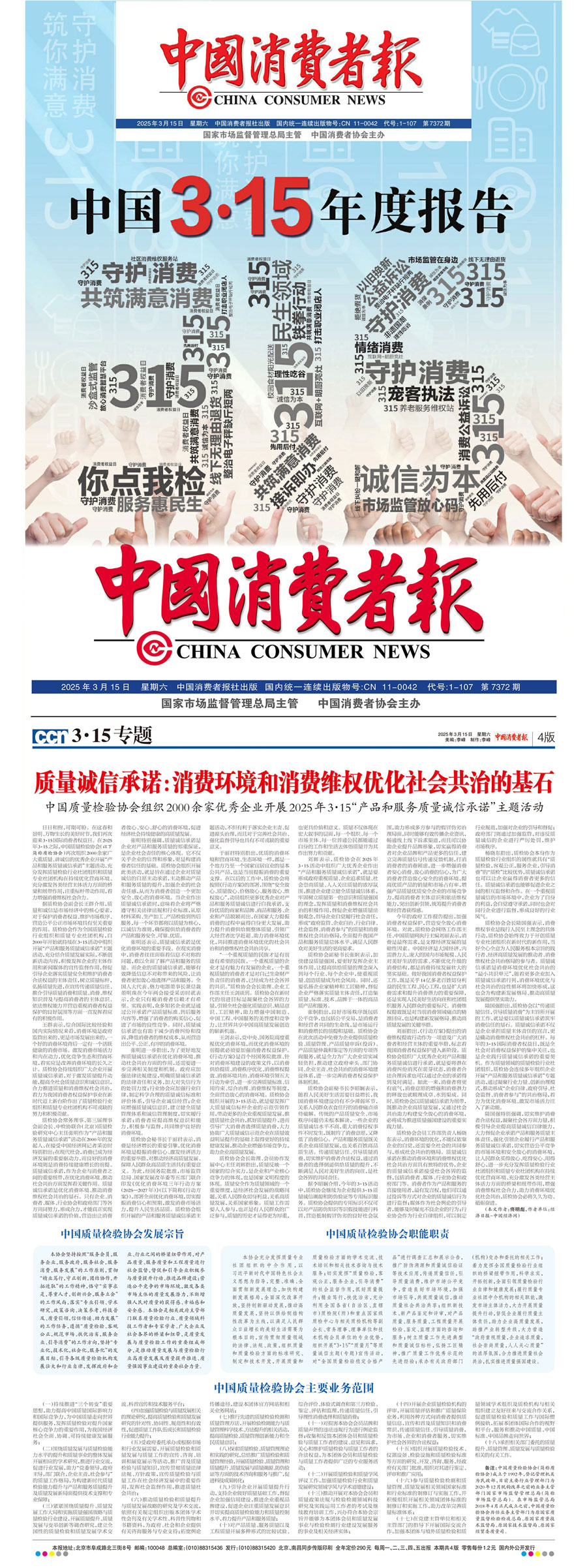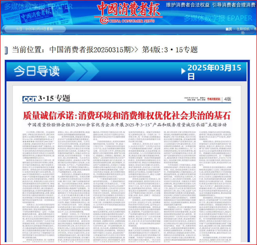 《中國(guó)消費(fèi)者報(bào)》(2025年3月15日刊)發(fā)布:質(zhì)量誠(chéng)信承諾:消費(fèi)環(huán)境和消費(fèi)維權(quán)優(yōu)化社會(huì)共治的基石——中國(guó)質(zhì)量檢驗(yàn)協(xié)會(huì)組織2000余家優(yōu)秀企業(yè)開(kāi)展2025年3·15“產(chǎn)品和服務(wù)質(zhì)量誠(chéng)信承諾”主題活動(dòng)
