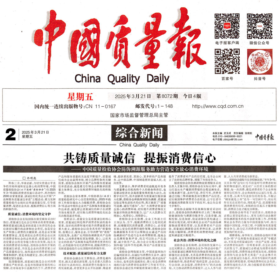 《中國(guó)質(zhì)量報(bào)》(2025年3月21日刊)發(fā)布:共鑄質(zhì)量誠(chéng)信 提振消費(fèi)信心——中國(guó)質(zhì)量檢驗(yàn)協(xié)會(huì)防偽溯源服務(wù)助力營(yíng)造安全放心消費(fèi)環(huán)境