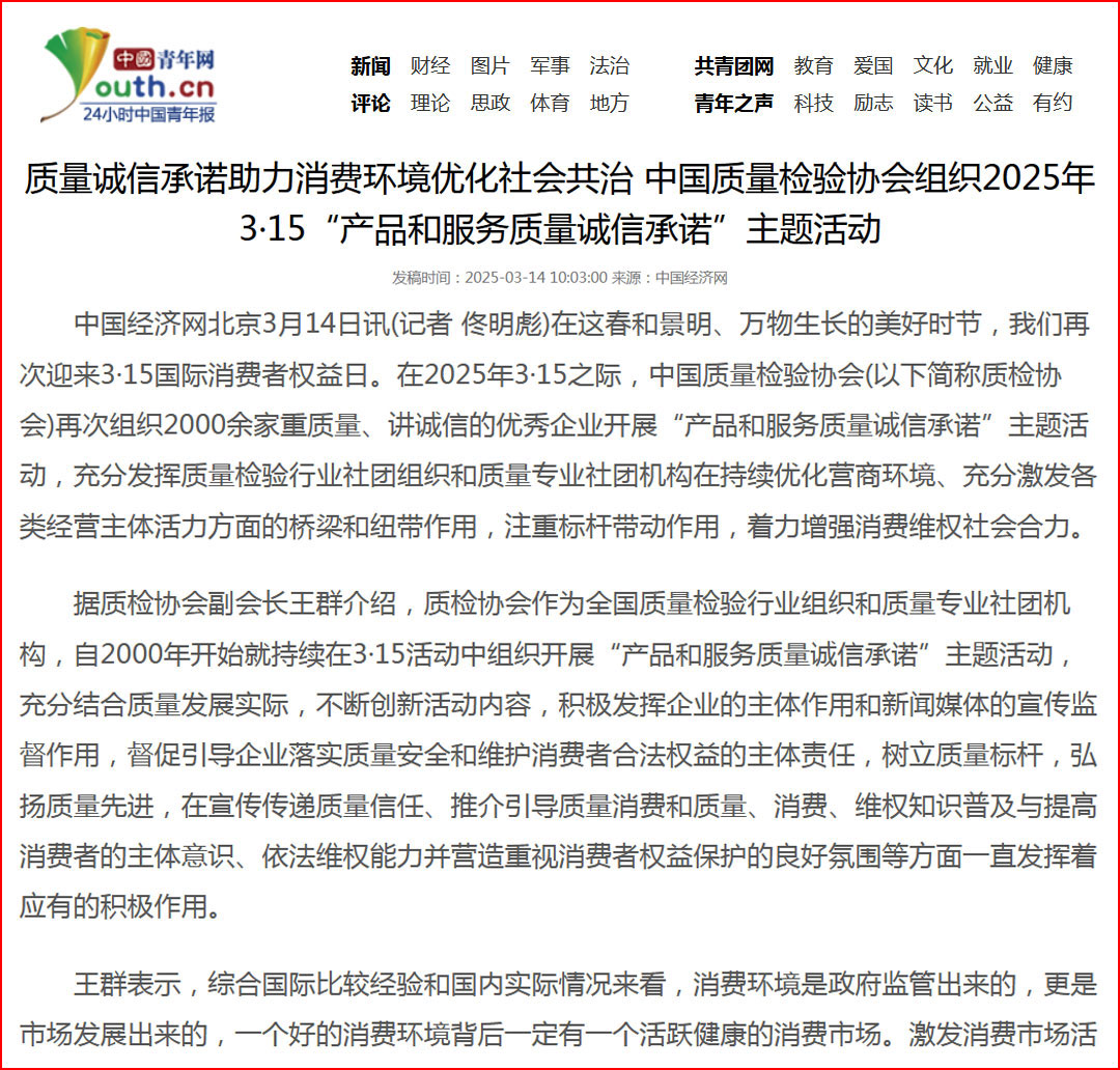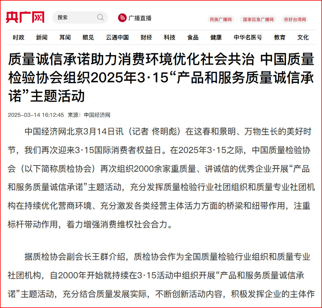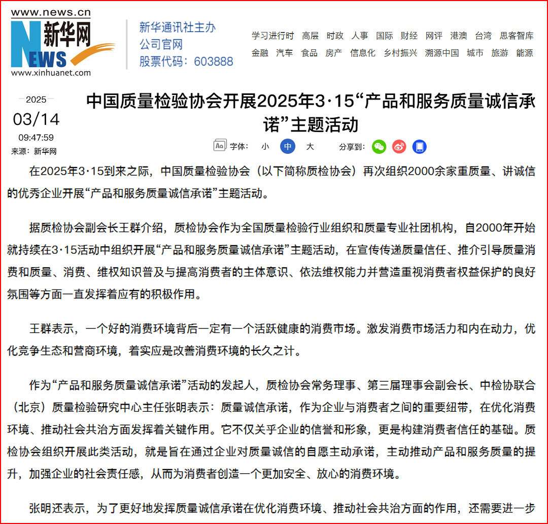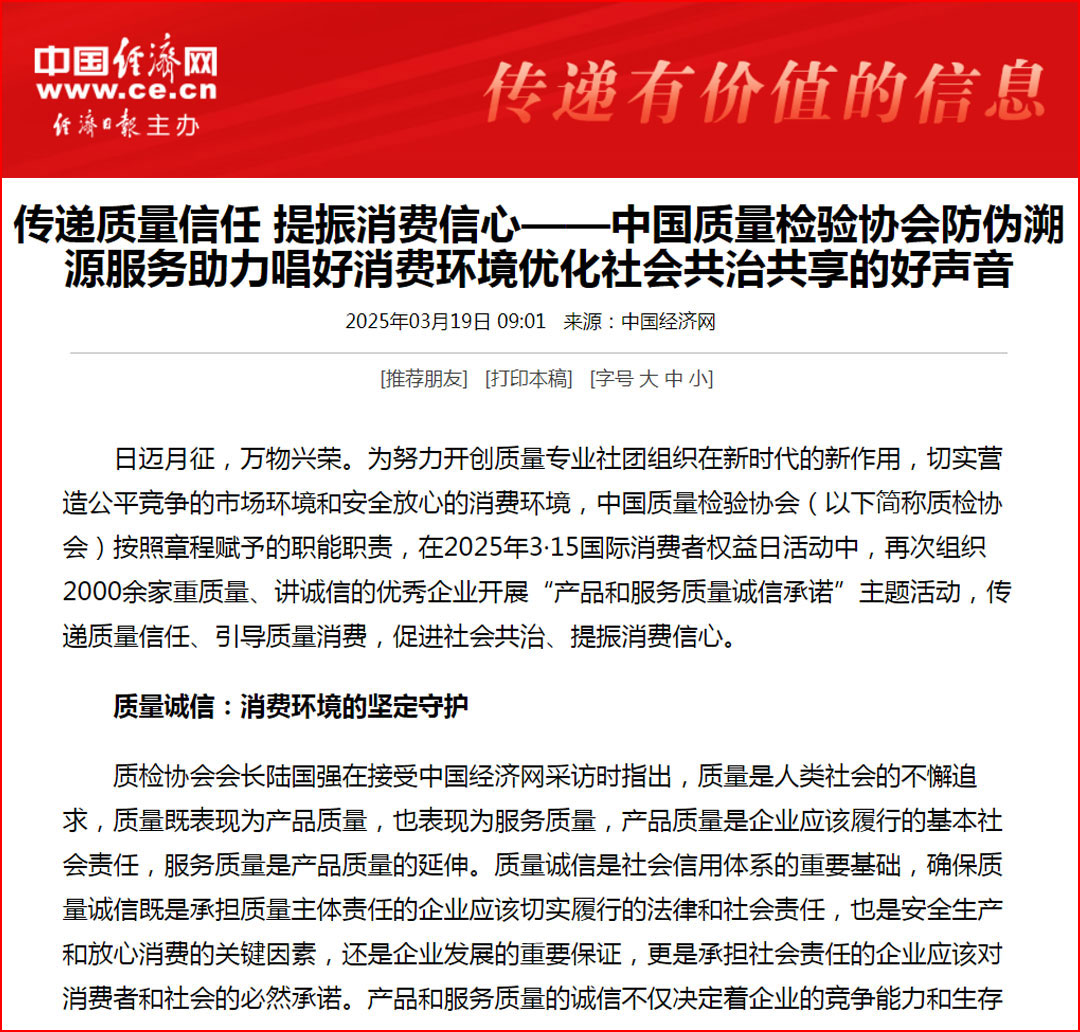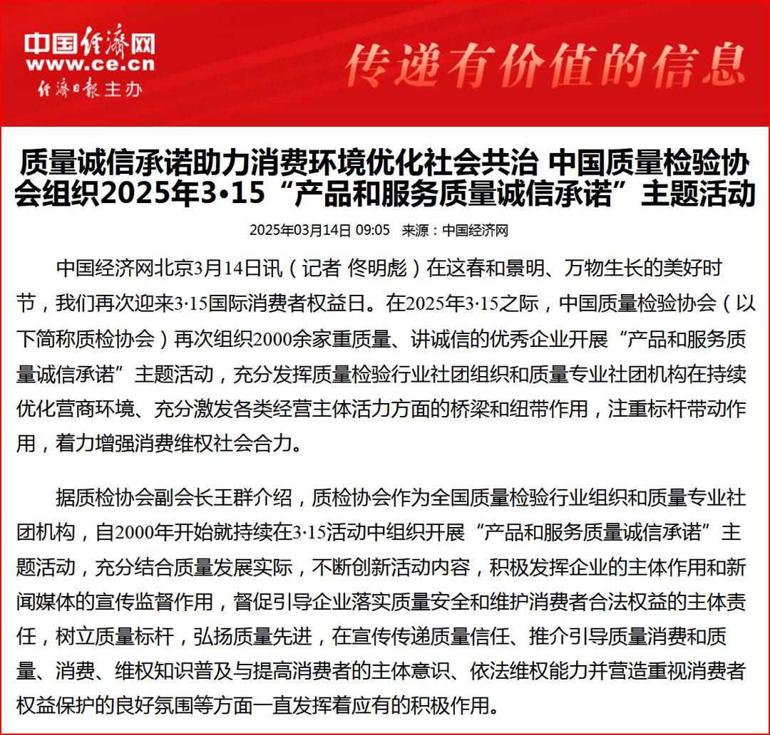 中國(guó)經(jīng)濟(jì)網(wǎng)“質(zhì)量經(jīng)濟(jì)頻道”發(fā)布:質(zhì)量誠(chéng)信承諾助力消費(fèi)環(huán)境優(yōu)化社會(huì)共治——中國(guó)質(zhì)量檢驗(yàn)協(xié)會(huì)組織2025年3·15“產(chǎn)品和服務(wù)質(zhì)量誠(chéng)信承諾”主題活動(dòng)