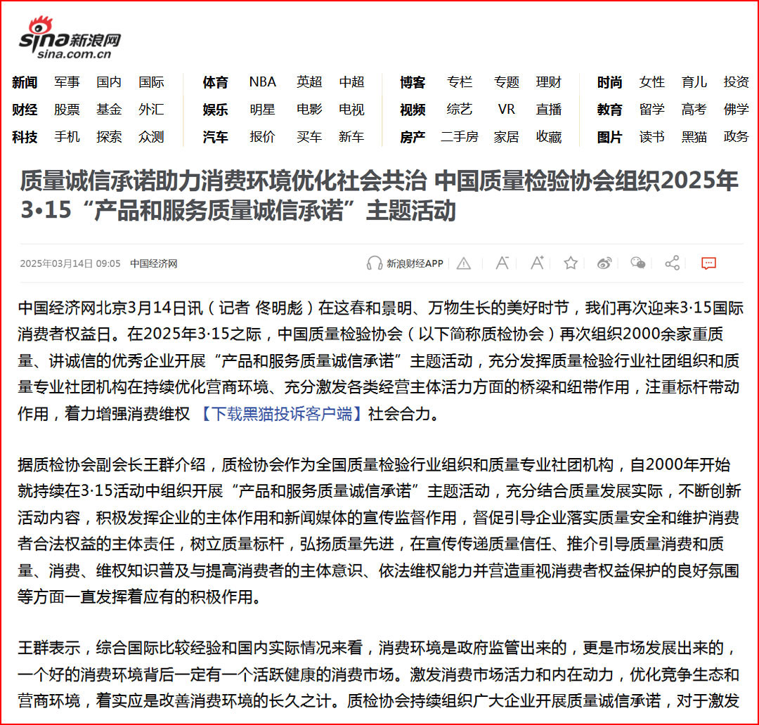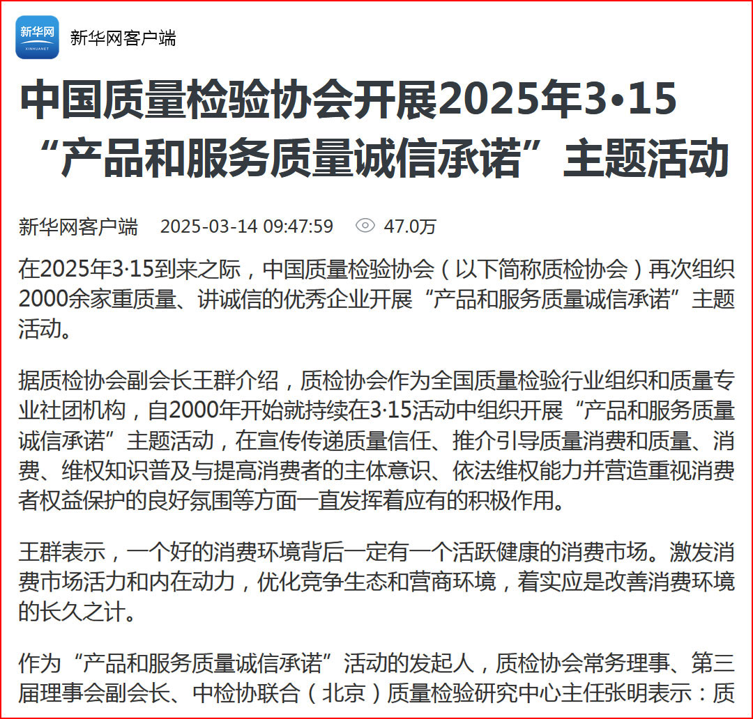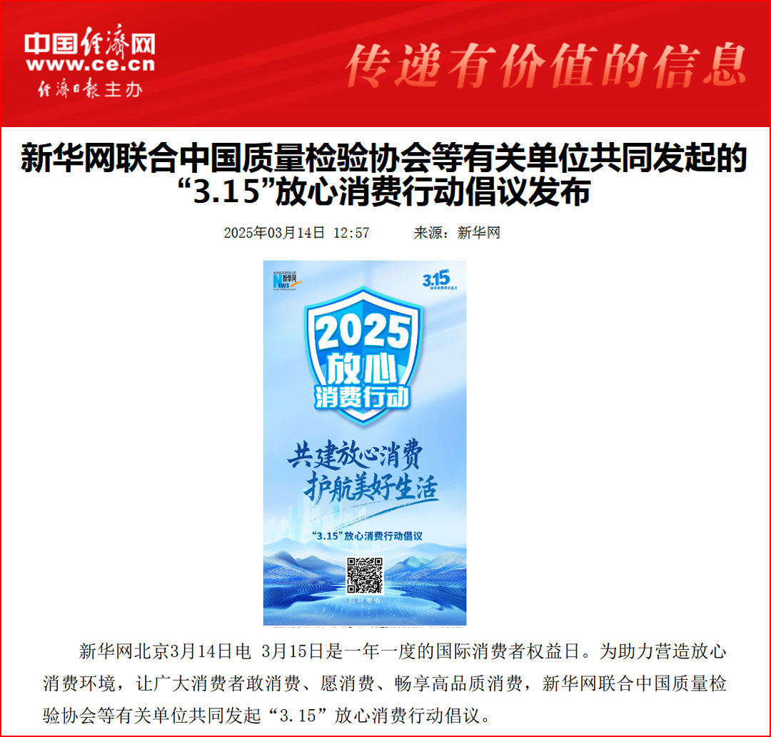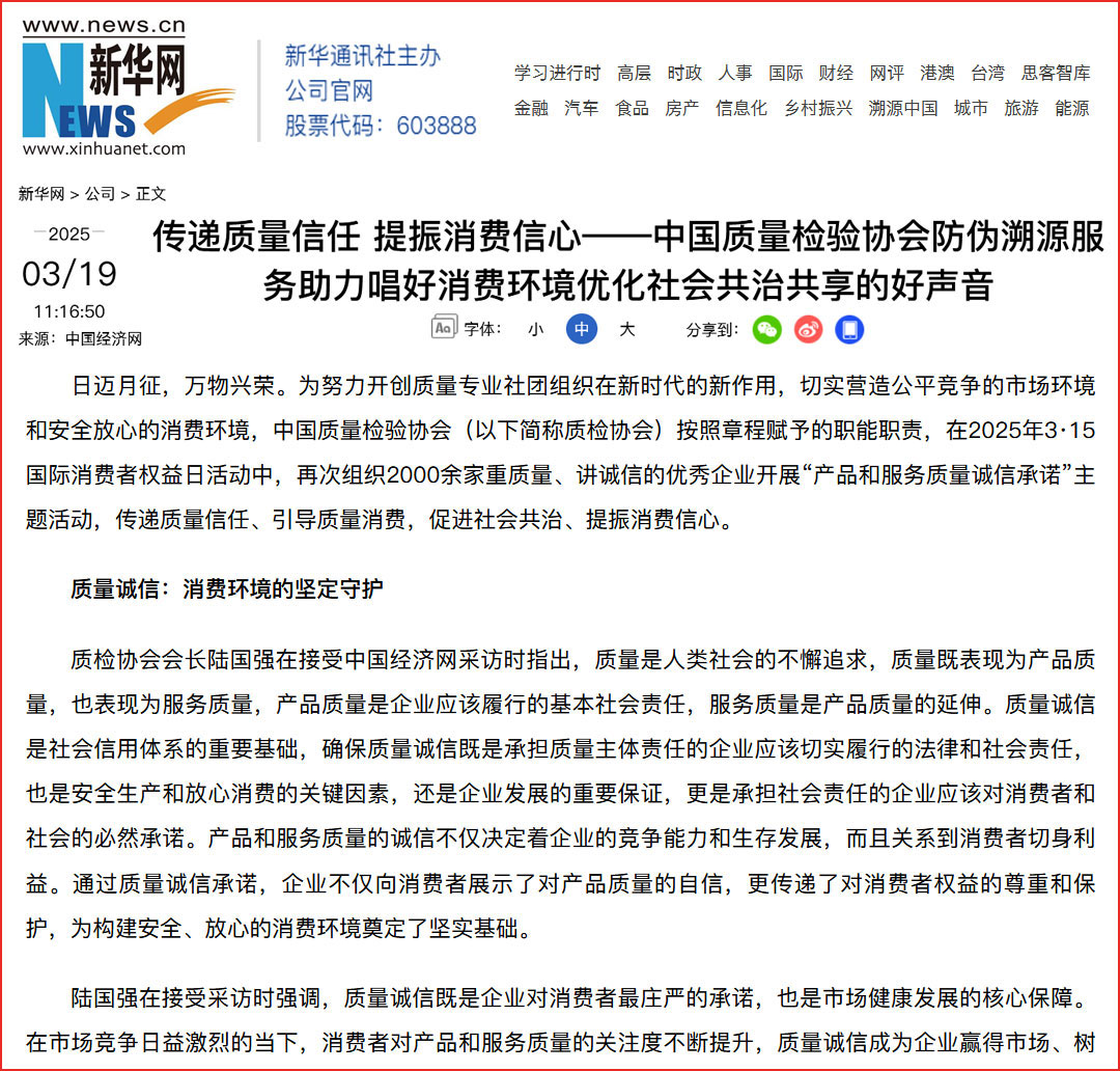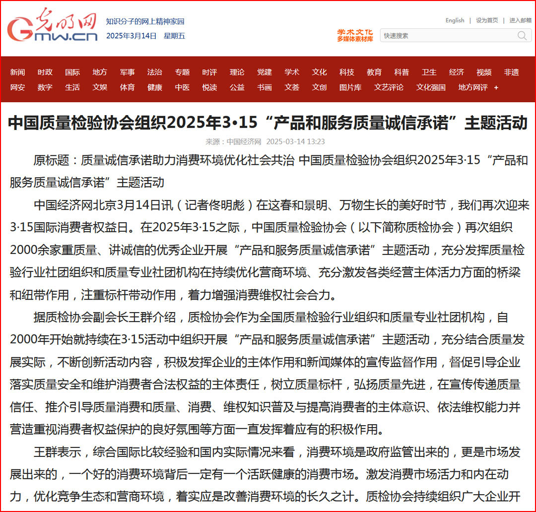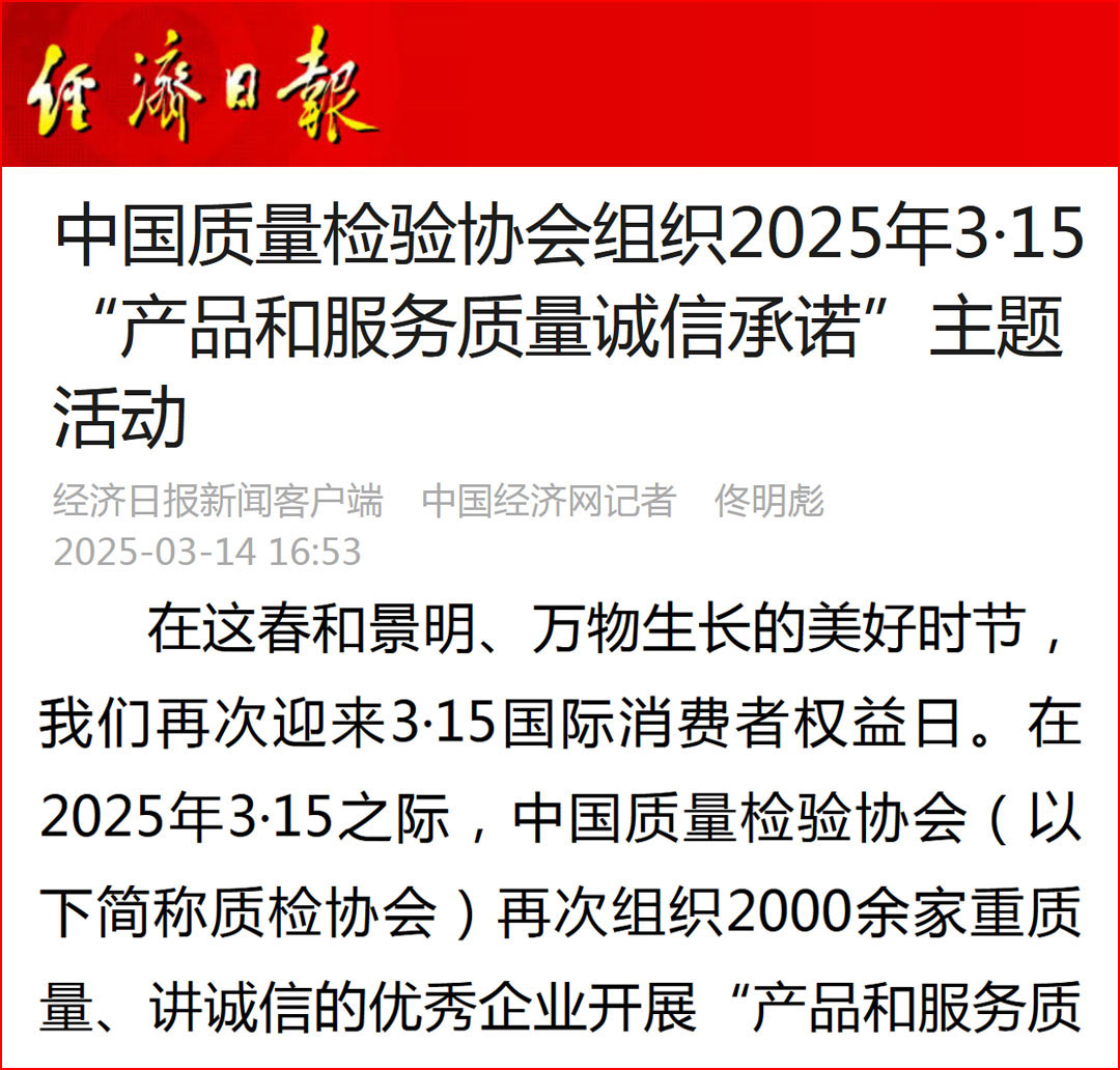 中國(guó)經(jīng)濟(jì)網(wǎng)“質(zhì)量經(jīng)濟(jì)頻道”發(fā)布:質(zhì)量誠(chéng)信承諾助力消費(fèi)環(huán)境優(yōu)化社會(huì)共治——中國(guó)質(zhì)量檢驗(yàn)協(xié)會(huì)組織2025年3·15“產(chǎn)品和服務(wù)質(zhì)量誠(chéng)信承諾”主題活動(dòng)