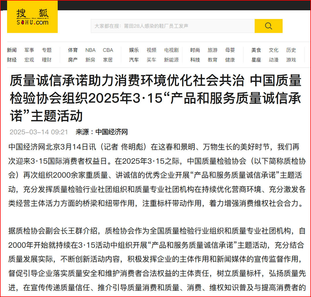搜狐網(wǎng)報(bào)道:質(zhì)量誠(chéng)信承諾助力消費(fèi)環(huán)境優(yōu)化社會(huì)共治——中國(guó)質(zhì)量檢驗(yàn)協(xié)會(huì)組織2025年3·15“產(chǎn)品和服務(wù)質(zhì)量誠(chéng)信承諾”主題活動(dòng)