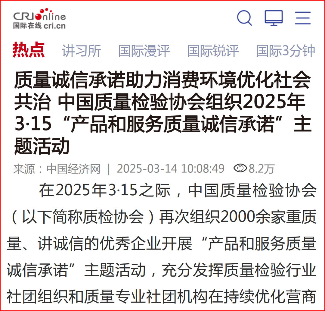 中國(guó)經(jīng)濟(jì)網(wǎng)“質(zhì)量經(jīng)濟(jì)頻道”發(fā)布:中國(guó)質(zhì)量檢驗(yàn)協(xié)會(huì)開(kāi)展2025年3·15“產(chǎn)品和服務(wù)質(zhì)量誠(chéng)信承諾”主題活動(dòng)
