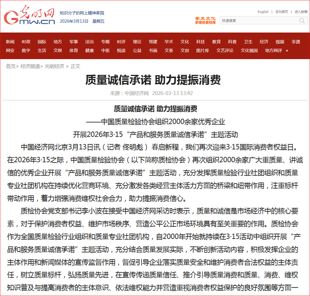 光明網(wǎng)報(bào)道:質(zhì)量誠信承諾 助力提振消費(fèi)——中國質(zhì)量檢驗(yàn)協(xié)會組織2000余家優(yōu)秀企業(yè)開展2026年3·15“產(chǎn)品和服務(wù)質(zhì)量誠信承諾”主題活動(dòng)