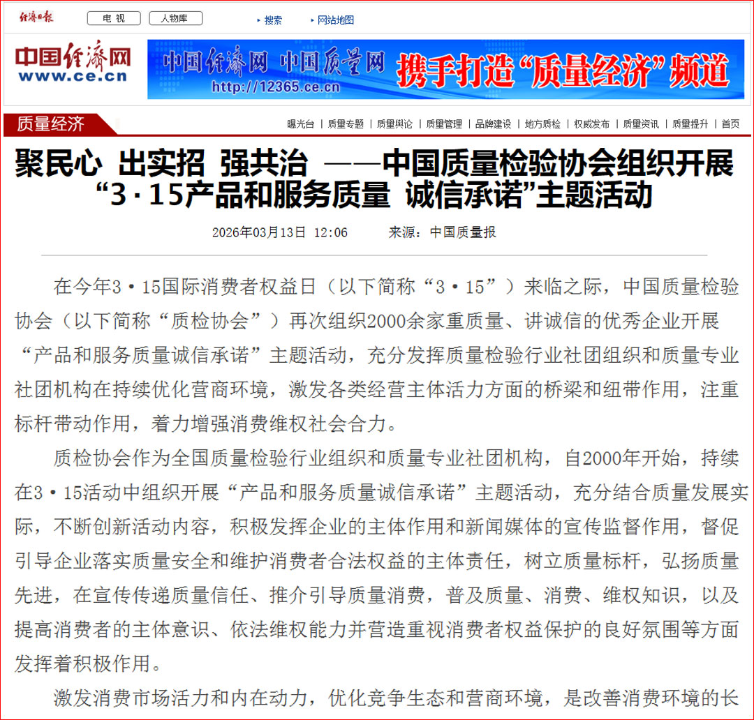 中國經(jīng)濟(jì)網(wǎng)發(fā)布:質(zhì)量誠信承諾 助力提振消費(fèi)——中國質(zhì)量檢驗(yàn)協(xié)會組織2000余家優(yōu)秀企業(yè)開展2026年3·15“產(chǎn)品和服務(wù)質(zhì)量誠信承諾”主題活動(dòng)