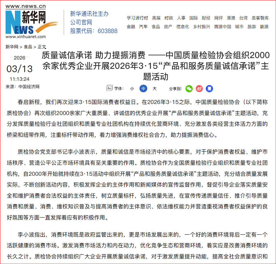 新華網(wǎng)報(bào)道:質(zhì)量誠信承諾 助力提振消費(fèi)——中國質(zhì)量檢驗(yàn)協(xié)會組織2000余家優(yōu)秀企業(yè)開展2026年3·15“產(chǎn)品和服務(wù)質(zhì)量誠信承諾”主題活動(dòng)