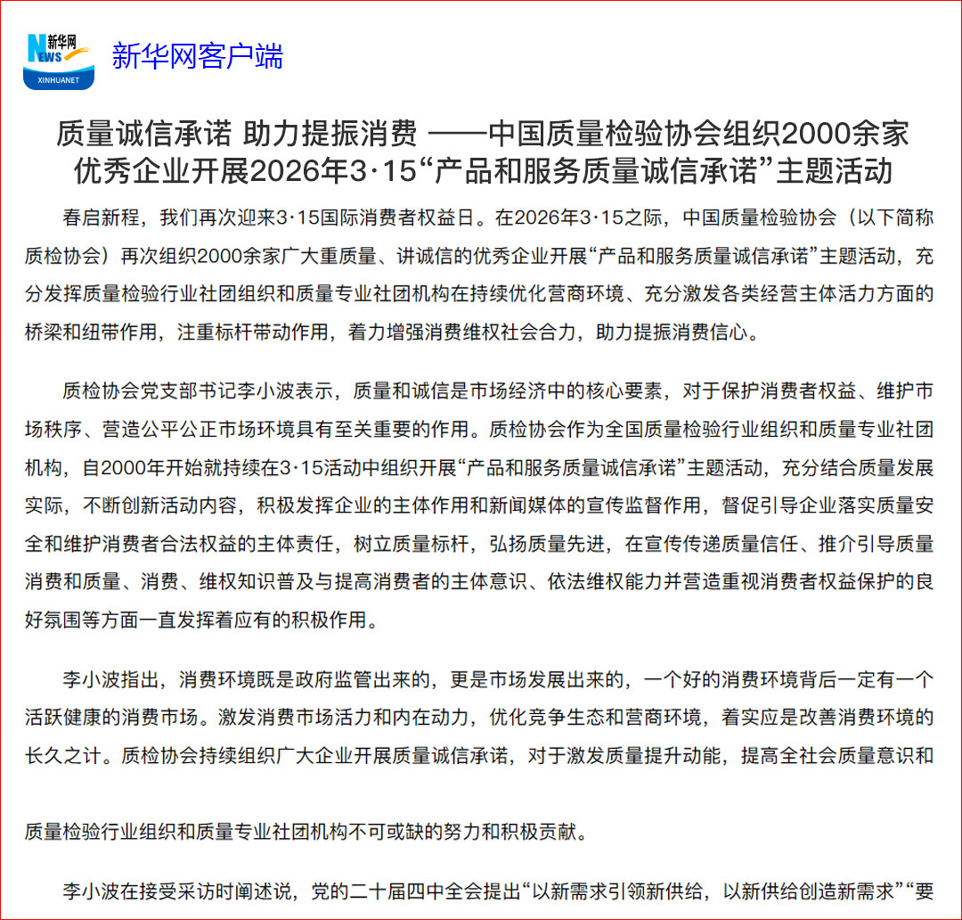 新華網(wǎng)客戶端報(bào)道:質(zhì)量誠信承諾 助力提振消費(fèi)——中國質(zhì)量檢驗(yàn)協(xié)會組織2000余家優(yōu)秀企業(yè)開展2026年3·15“產(chǎn)品和服務(wù)質(zhì)量誠信承諾”主題活動(dòng)