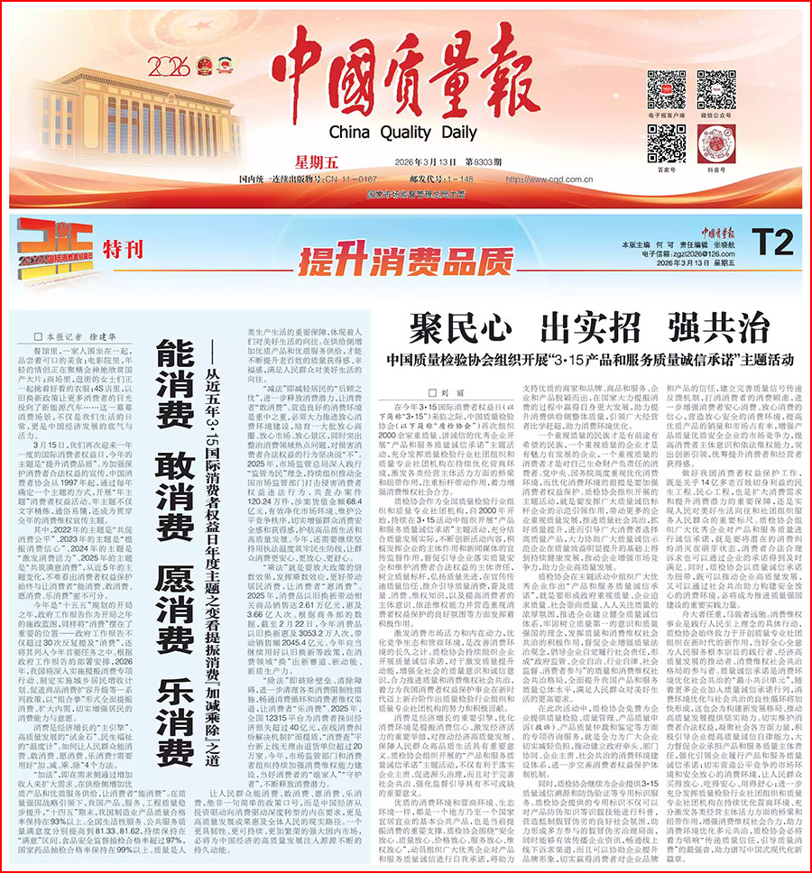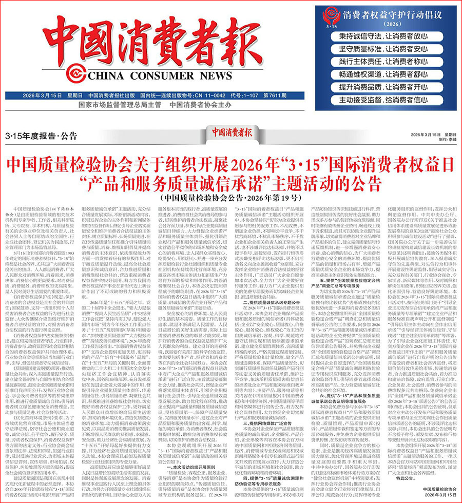 《中國消費(fèi)者報(bào)》(2026年3月15日刊)發(fā)布:中國質(zhì)量檢驗(yàn)協(xié)會關(guān)于組織開展2026年“3·15”國際消費(fèi)者權(quán)益日“產(chǎn)品和服務(wù)質(zhì)量誠信承諾”主題活動(dòng)的公告(中國質(zhì)量檢驗(yàn)協(xié)會公告·2026年第19號)