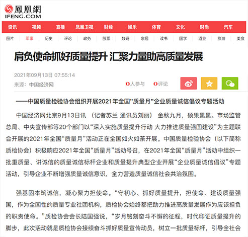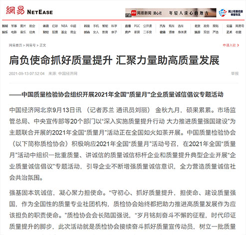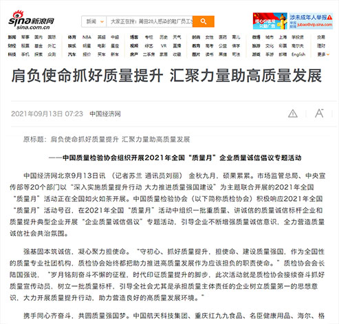 新浪網(wǎng):肩負使命抓好質(zhì)量提升 匯聚力量助高質(zhì)量發(fā)展——中國質(zhì)量檢驗協(xié)會組織開展2021年全國“質(zhì)量月”企業(yè)質(zhì)量誠信倡議專題活動