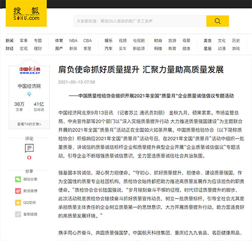 搜狐網(wǎng):肩負使命抓好質(zhì)量提升 匯聚力量助高質(zhì)量發(fā)展——中國質(zhì)量檢驗協(xié)會組織開展2021年全國“質(zhì)量月”企業(yè)質(zhì)量誠信倡議專題活動