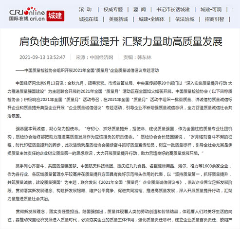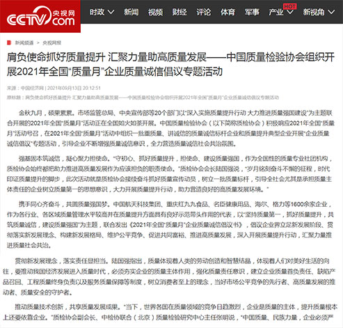 中央廣播電視總臺國際在線:肩負使命抓好質(zhì)量提升 匯聚力量助高質(zhì)量發(fā)展——中國質(zhì)量檢驗協(xié)會組織開展2021年全國"質(zhì)量月"企業(yè)質(zhì)量誠信倡議專題活動