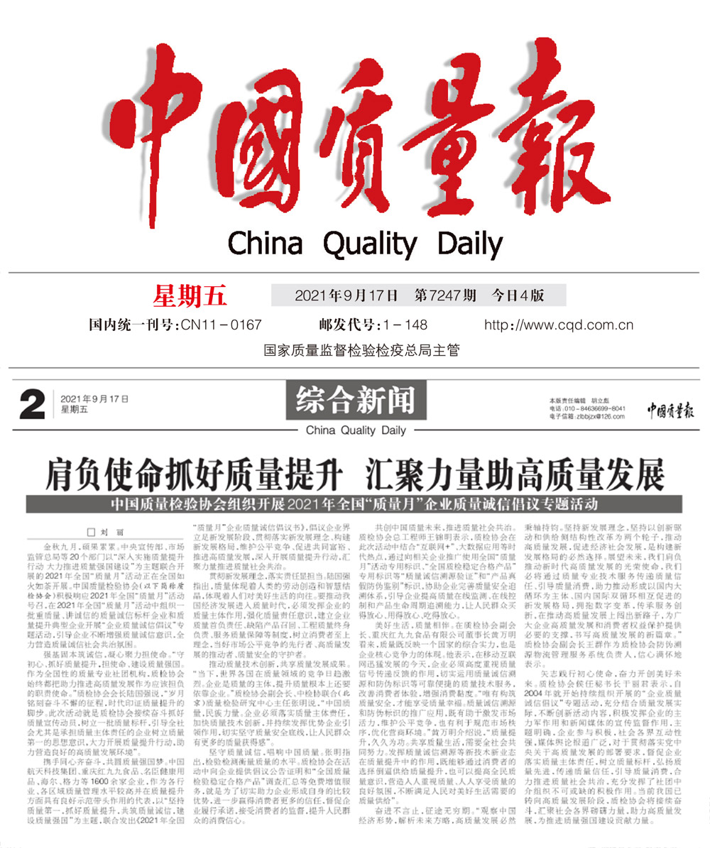 中國質(zhì)量報:肩負使命抓好質(zhì)量提升匯聚力量助高質(zhì)量發(fā)展——中國質(zhì)量檢驗協(xié)會組織開展2021年全國“質(zhì)量月”企業(yè)質(zhì)量誠信倡議專題活動