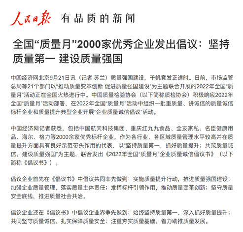 人民網(wǎng):全國(guó)“質(zhì)量月”2000家優(yōu)秀企業(yè)發(fā)出倡議:堅(jiān)持質(zhì)量第一 建設(shè)質(zhì)量強(qiáng)國(guó)