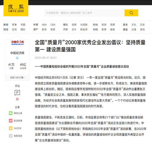 搜狐網(wǎng):匯聚力量攜手抓好質(zhì)量提升 肩負(fù)使命促進(jìn)質(zhì)量強(qiáng)國(guó)建設(shè)——2022年全國(guó)“質(zhì)量月”企業(yè)質(zhì)量誠(chéng)信倡議活動(dòng)綜述