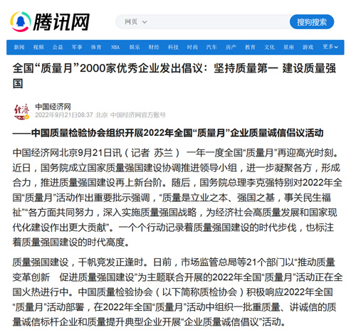 騰訊網(wǎng):匯聚力量攜手抓好質(zhì)量提升 肩負(fù)使命促進(jìn)質(zhì)量強(qiáng)國(guó)建設(shè)——2022年全國(guó)“質(zhì)量月”企業(yè)質(zhì)量誠(chéng)信倡議活動(dòng)綜述