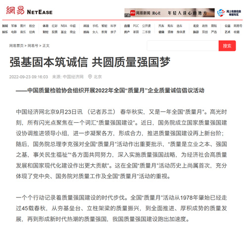 網(wǎng)易網(wǎng):強(qiáng)基固本筑誠(chéng)信 共圓質(zhì)量強(qiáng)國(guó)夢(mèng)——中國(guó)質(zhì)量檢驗(yàn)協(xié)會(huì)組織開展2022年全國(guó)“質(zhì)量月”企業(yè)質(zhì)量誠(chéng)信倡議活動(dòng)