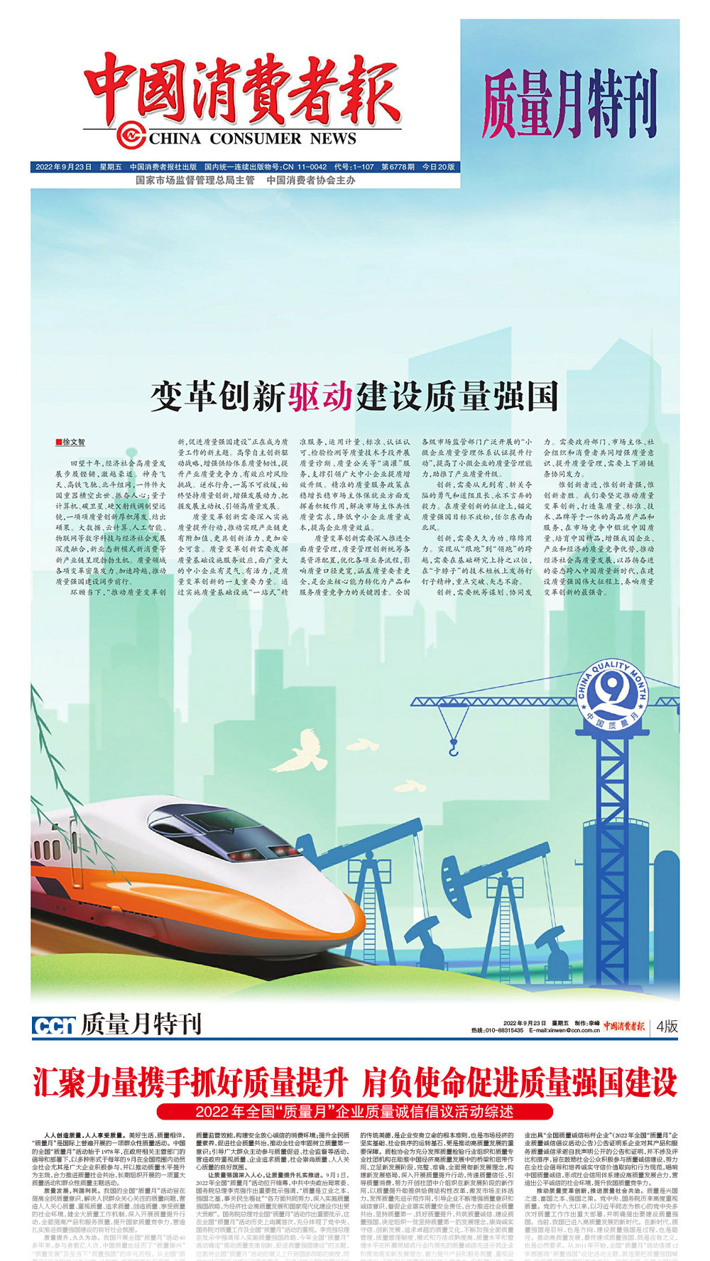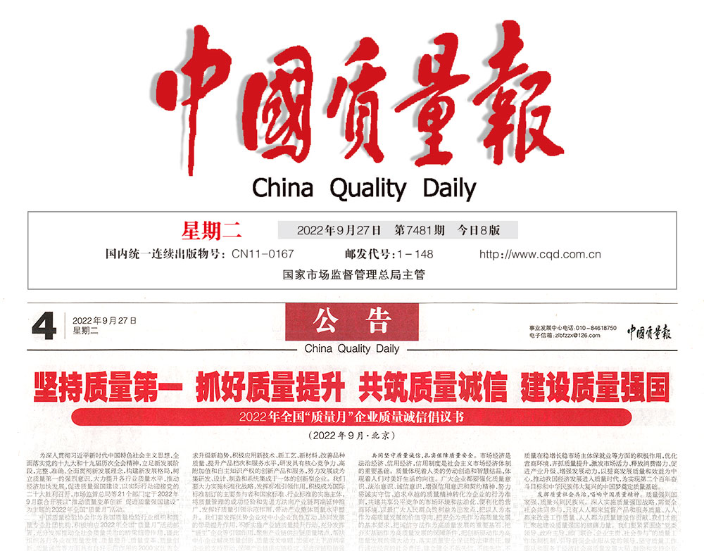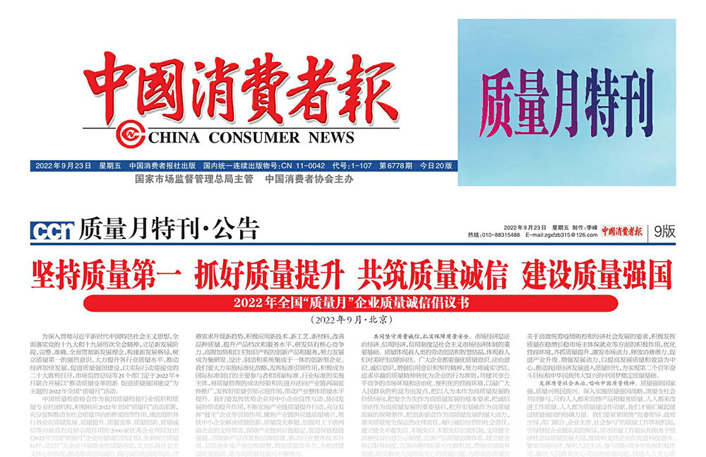 中國(guó)消費(fèi)者報(bào):堅(jiān)持質(zhì)量第一 抓好質(zhì)量提升 共筑質(zhì)量誠(chéng)信 建設(shè)質(zhì)量強(qiáng)國(guó)
