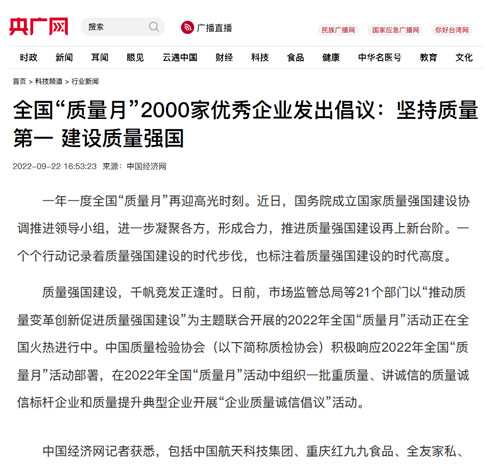 中央廣播電視總臺(tái)央廣網(wǎng):全國(guó)“質(zhì)量月”2000家優(yōu)秀企業(yè)發(fā)出倡議:堅(jiān)持質(zhì)量第一 建設(shè)質(zhì)量強(qiáng)國(guó)