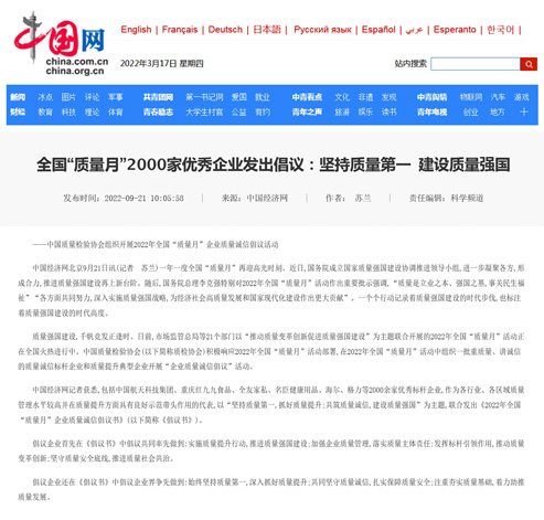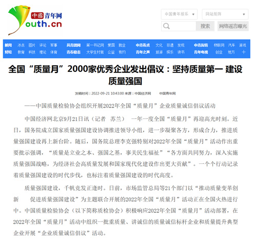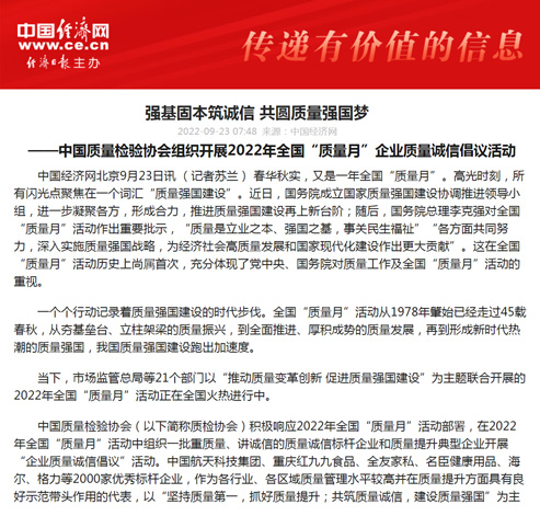 中國(guó)經(jīng)濟(jì)網(wǎng):匯聚力量攜手抓好質(zhì)量提升 肩負(fù)使命促進(jìn)質(zhì)量強(qiáng)國(guó)建設(shè)——2022年全國(guó)“質(zhì)量月”企業(yè)質(zhì)量誠(chéng)信倡議活動(dòng)綜述