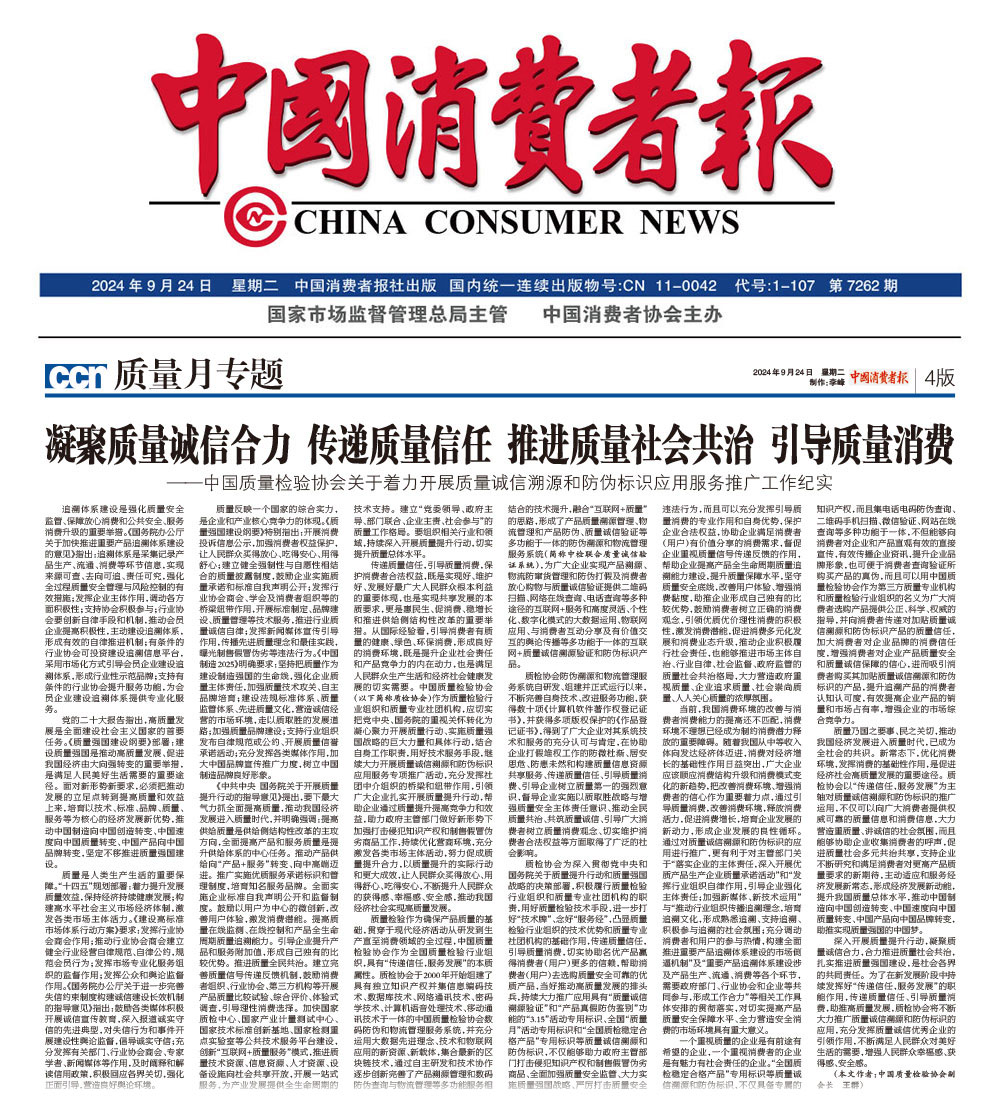 - 中國消費者報—凝聚質(zhì)量誠信合力 傳遞質(zhì)量信任 推進質(zhì)量社會共治 引導質(zhì)量消費——中國質(zhì)量檢驗協(xié)會關(guān)于著力開展質(zhì)量誠信溯源和防偽標識應用服務推廣工作紀實