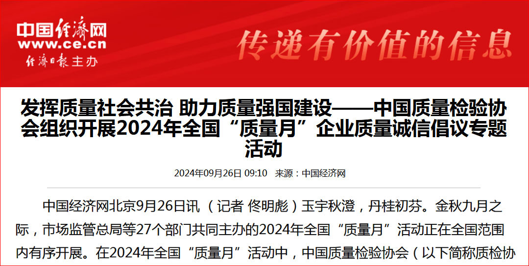 - 中國經(jīng)濟網(wǎng)—發(fā)揮質(zhì)量社會共治 助力質(zhì)量強國建設——中國質(zhì)量檢驗協(xié)會組織開展2024年全國“質(zhì)量月”企業(yè)質(zhì)量誠信倡議專題活動